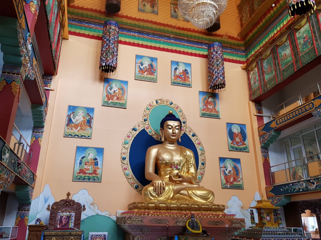 Świątynia jest nowym budynkiem otwartym w 2004 roku. Na terenie kompleksu znajduje się osiem stup umieszczonych tam w roku 2005. W głownej świątyni znajdujemy ulany z brązu i pokryty złotem 6 metrowy posąg Buddy. W buddyzmie istnieje tradycja chodzenia dookoła świątyni, aby dokonać garo. Garo jest okrążeniem stup, świątyni lub młynków modlitewnych zgodnie ze wskazówkami zegara. Obracanie młynków daje ten sam efekt, co ustne recytowanie modlitwy. Słowa modlitwy wypisane są na młynku lub w jego środku. Ot tak na skróty… Zastnawiam się jak to działa, gdy kręci się w odwrotnym kierunku, bo zawsze chodziłam pod prąd…