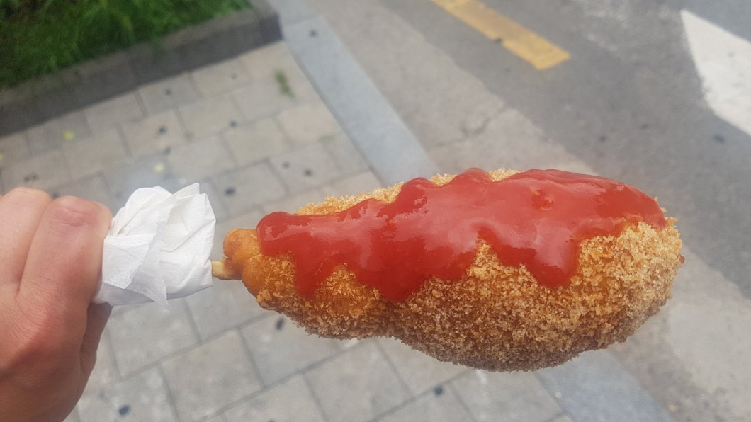 Gdyby były to buddyjskie świątynie zapewne odpusciłabym sobie większość z nich i podreptała gdzieś do restauracji, oglądanie kolejnego pozłacanego buddy, dzwoneczka, śmierdzidełka stało się monotonne już jakiś czas temu. Ale pałace to inna sprawa, więc z nową dawką energii maszeruję w stronę największego z nich, Pałacu Gyeongbokgung. W brzuchu burczy, przechodząc koło kolejnej restauracji wyglądam jak pies Pawłowa. Czasu jednakże nie mam, dodatkowo boję się, że po obiedzie wzmożona siła grawitacji może mnie spowolnić. A w głowie cały czas żarcie… Decyduję się więc na COŚ ze straganu. COSIÓW jest parę, wybieram jednego, ląduje on w mikrofali, sprzedawczyni językiem migowym pyta się, czy chcę keczup. A dawaj i keczup!