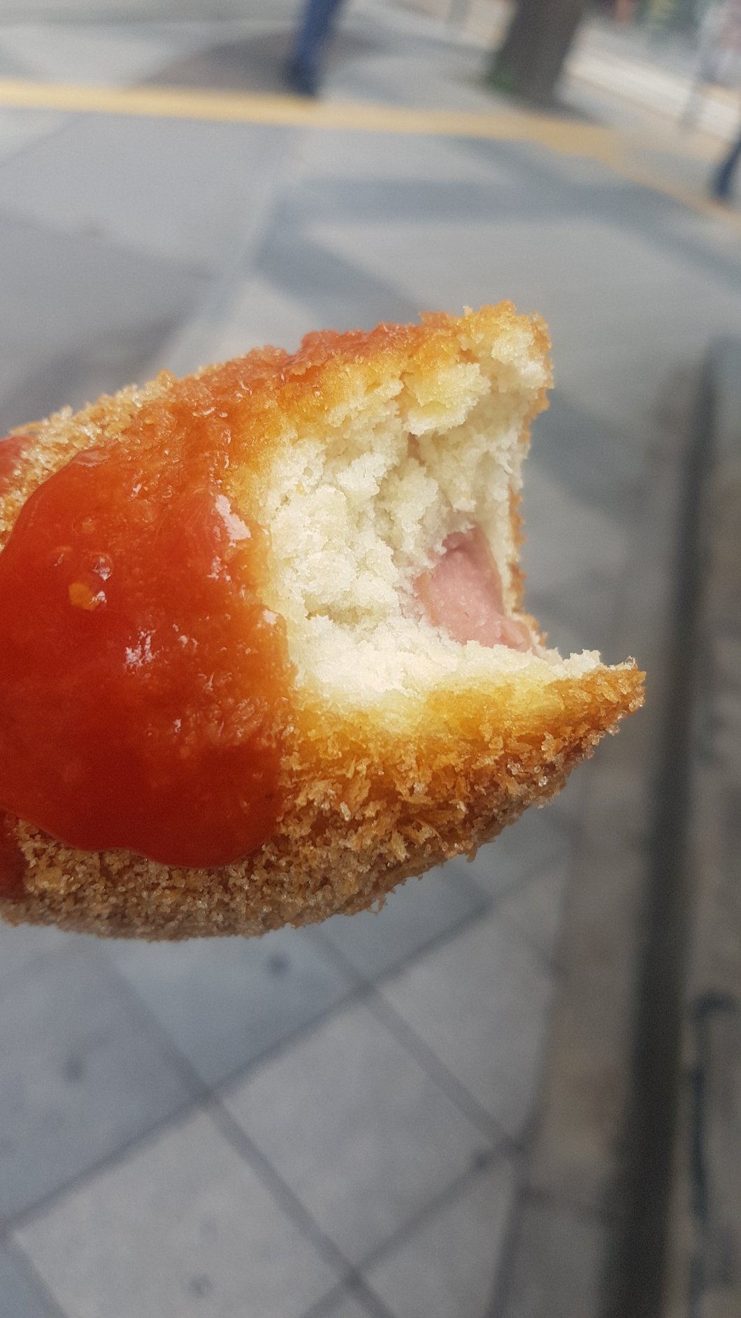 Ok, chwila prawdy… COŚ Okazuje się być pączkiem, chyba niesłodkim, w jakiejś panierce obtoczonej cukrem, z parówką w środku. Normalnie powiedziałabym a pfuuuuj, ale wsuwam go, aż się uszy trzęsą.