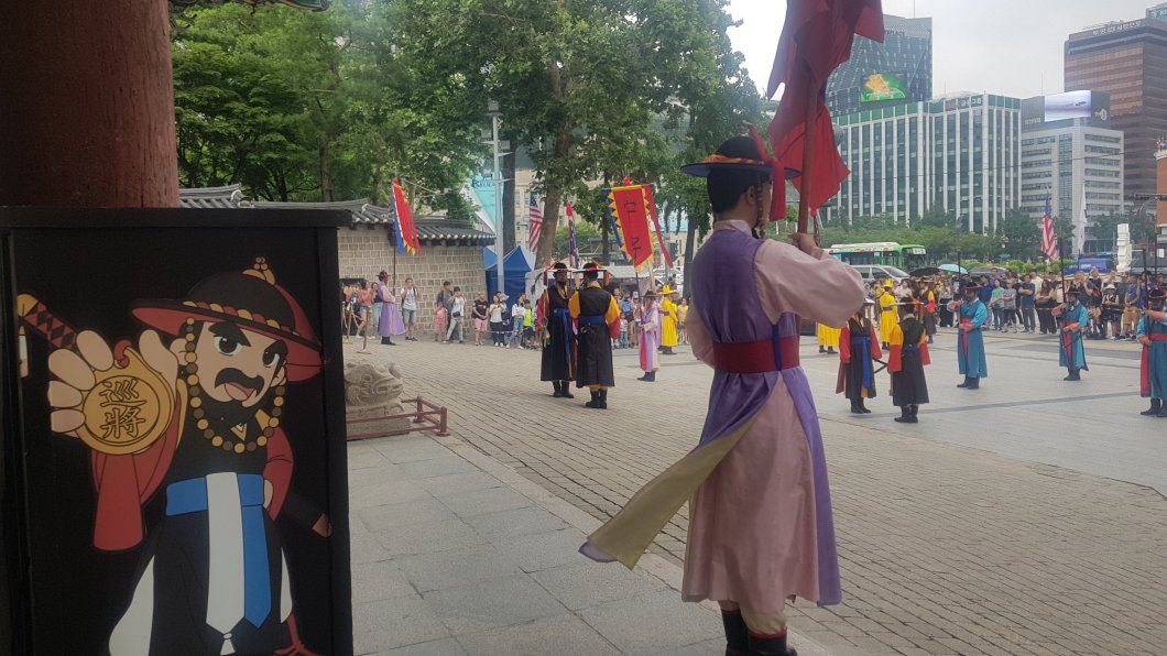 Przechodzę koło Pałacu Deoksegung, przed którym właśnie odbywa się zmiana warty. Jest to świetna okazja, aby liznąć trochę kultury koreańskiej, jedna z tych rzeczy w Seulu, którą trzeba zobaczyć. Uroczystość trwa około pół godziny, strażnicy ubrani są w tradycyjne, cesarskie stroje, noszą oni tradycyjną broń, towarzyszą jej tradycyjne instrumenty. W przeszłości do ich obowiązków należało patrolowanie bram, sprawdzanie osób wchodzących do pałacu oraz jego ochrona. Jako że byli podzieleni na dwie zmiany, dzienną i nocną, ceremonia miała miejsce dwa razy dziennie. Początkowo, we wczesnym okresie panowania dynastii Joseon, gdy główną siedzibą władców Korei był Pałac Gyeongbokgung, zmiana wart miała miejsce tam, jednakże po spaleniu go przez Japończyków pod koniec XVI w. Pałac Deoksehung stał się miejscem rezydentury cesarza. Ceremonia ta jest bardzo interesująca, ciężko mi jednak robić zdjęcia, bo obgryzam COSIA.