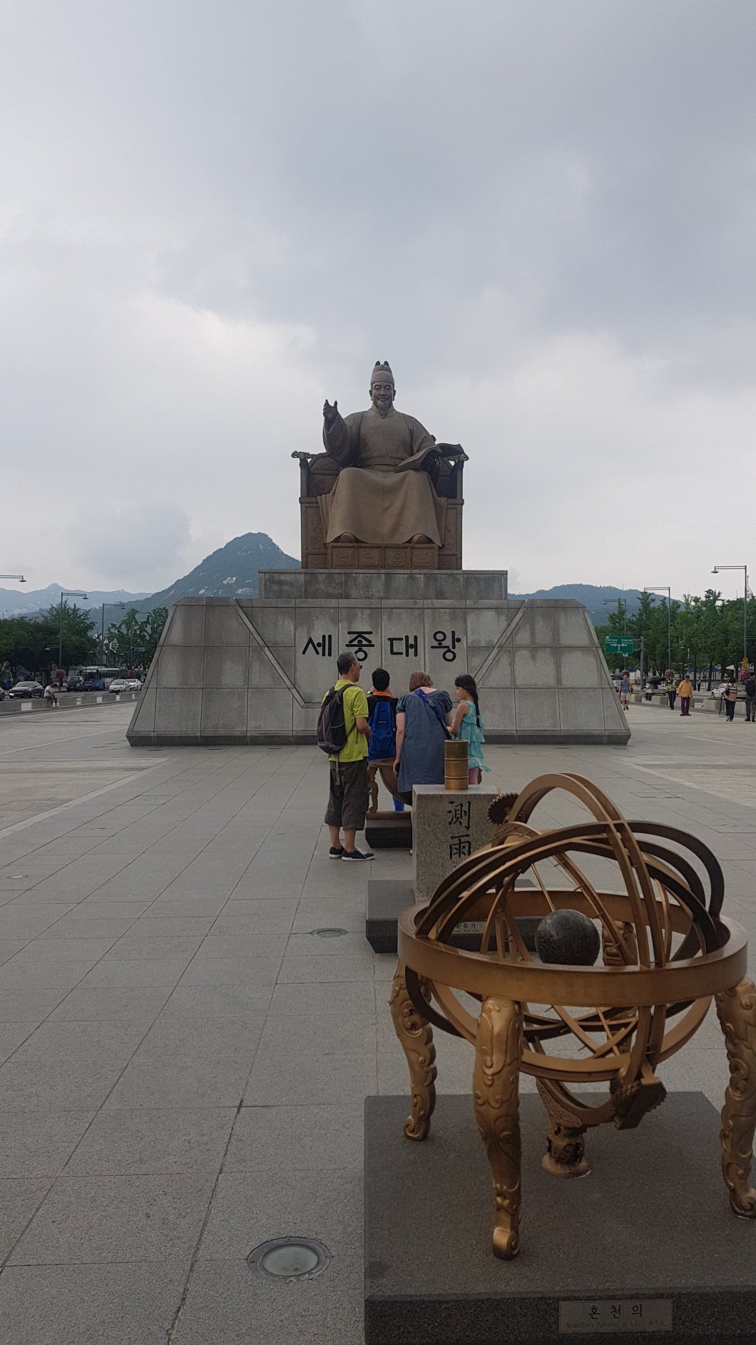 Niewielka odległość miedzy pałacami daje mi szansę zobaczenia czterech z pięciu. O piątym mogę zapomnieć, ale biorąc pod uwagę, że są one do siebie podobne, niespecjalnie mnie to martwi. Na skwerku prowadzącym do Pałacu Gyeongbpkgung mijam pomnik cesarza Sejonga, czwartego władcy z dynastii Joseon, który panował w latach 1418-1450. Z miejeca tego jest dobry widok na górę Bukashan, najwyższy okoliczny szczyt, na który jakoś wpełzłam wczoraj.